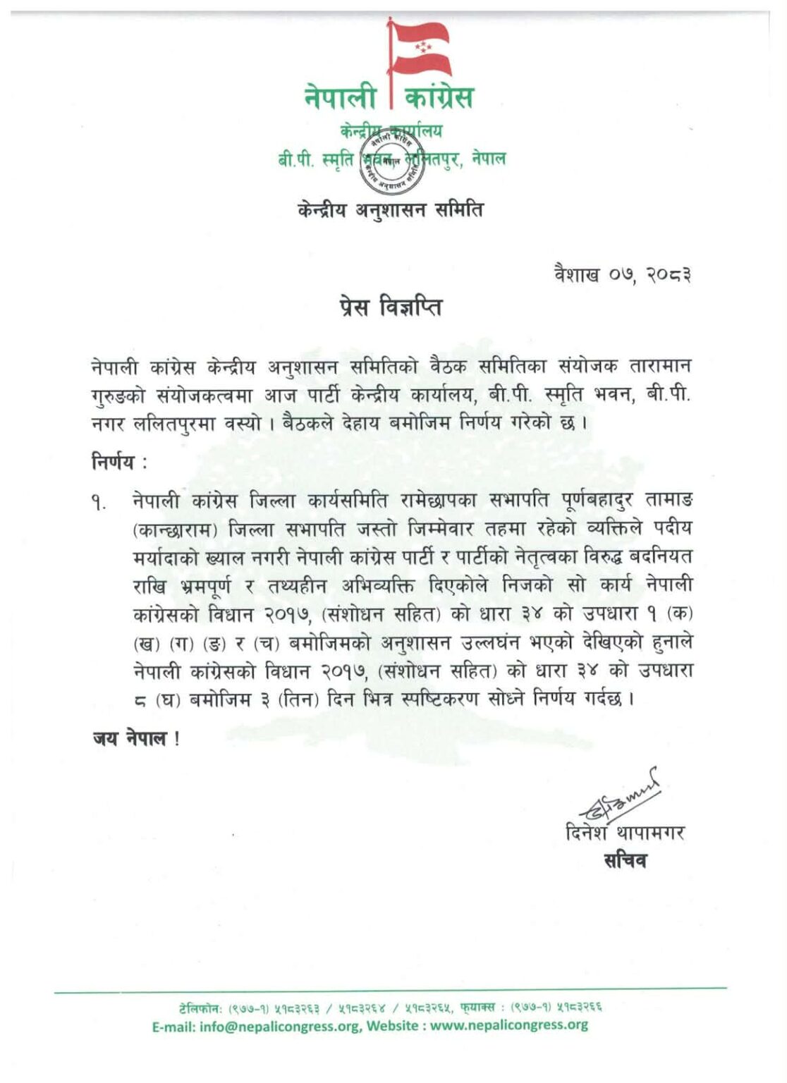 काठमाडौं । नेपाली कांग्रेसले आन्तरिक अनुशासनलाई कडाइका साथ कार्यान्वयन गर्ने संकेत दिँदै रामेछाप जिल्ला कार्यसमिति सभापति पूर्णबहादुर तामाङ (कान्छाराम)सँग तीन दिने स्पष्टीकरण मागेको छ।