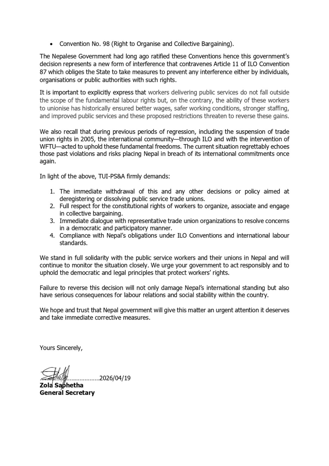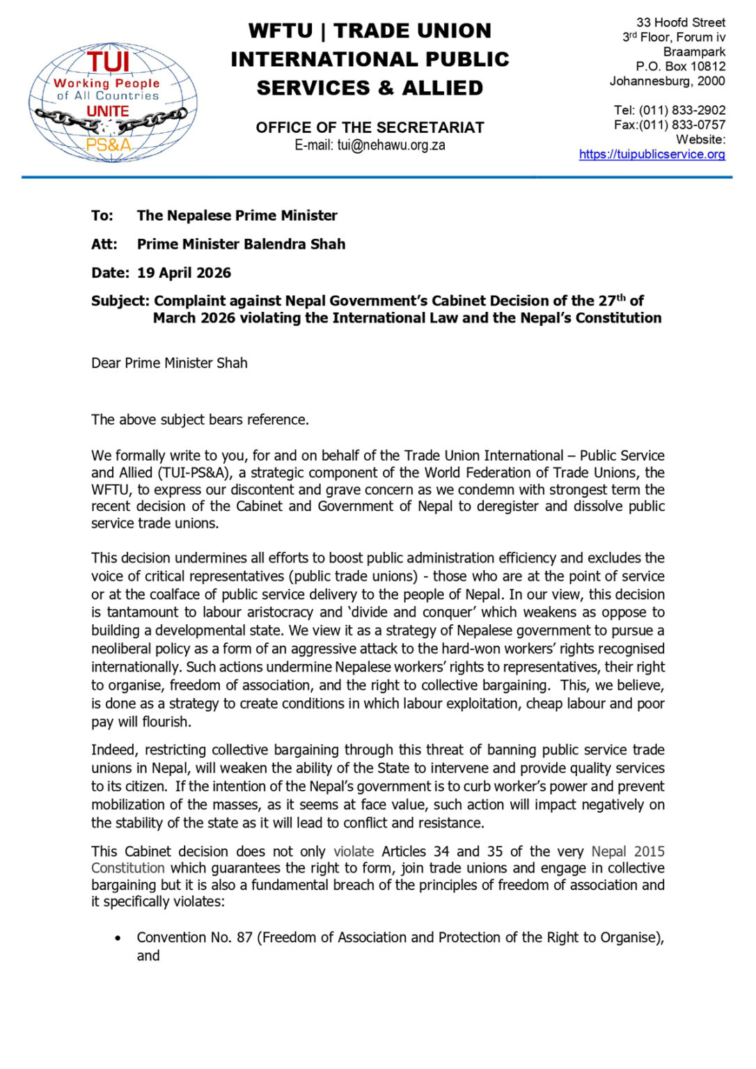 प्रधानमन्त्री बालेन्द्र शाहलाई सम्बोधन गर्दै पठाइएको औपचारिक पत्रमा ट्रेड युनियन इन्टरनेशनल पब्लिक सर्भिस एन्ड एलायड (टीयूआई–पीएस एन्ड ए) ले मन्त्रिपरिषद्को निर्णयप्रति गम्भीर चिन्ता व्यक्त गरेको हो। वर्ल्ड फेडेरेसन अफ ट्रेड युनियनसँग आबद्ध उक्त संस्थाले सरकारी कदमले श्रमिकहरूको मौलिक अधिकारमाथि प्रत्यक्ष आघात पुर्याउने चेतावनी दिएको छ।